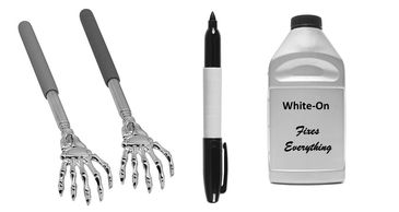 Three super science tools! Use our super efficient hand-held forest rakes to fire-proof large tracks of mismanaged forests. Edit bad or fake science with infallible permanent ink (especially useful for climate change and weather edits) or simply cover it up with White-on. All three are guaranteed to make you the envy of your professional colleagues.
